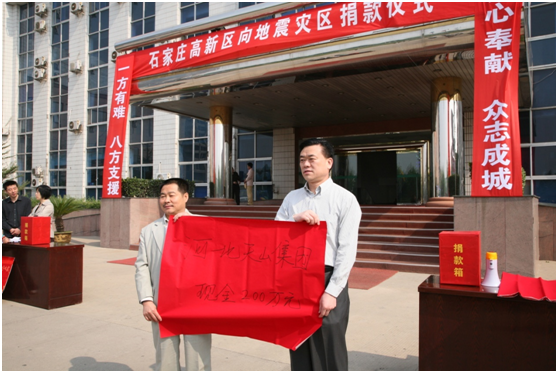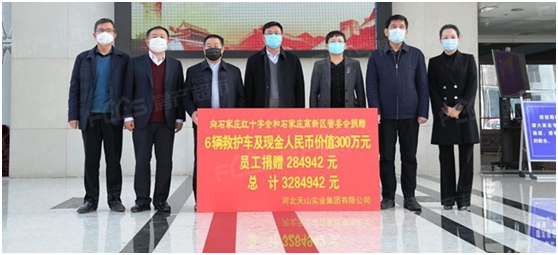 在今年年初,为坚决打赢新型冠状病毒疫情防控战,天山集团向石家庄市红十字会和石家庄高新区管委会捐赠六辆救护车及现金人民币价值300万元,员工捐赠28.4942万元,天山集团捐款总额已达328.4942万元。