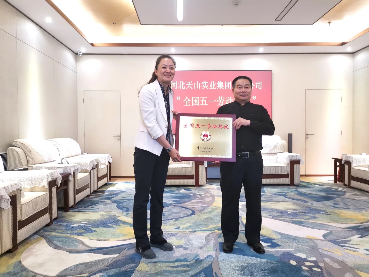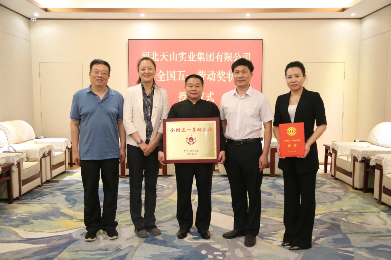 2021年7月13日,天山集团荣获“全国五一劳动奖状”授牌仪式隆重举行。中华全国总工会办公厅巡视员,督查室主任姜晓捷、石家庄市总工会副主席张宝山,经济部部长史跃华,石家庄高新区总工会主席于云川、部长张建东,以及全国总工会驻高新区总工会工作组景思詹、钟扬等领导一行应邀出席授牌仪式。天山集团党委书记、董事局主席吴振山、集团副总裁兼外事集团总裁王辉霞、集团综合办主任郑焕章、集团工会主席成国栋参加了授牌仪式。